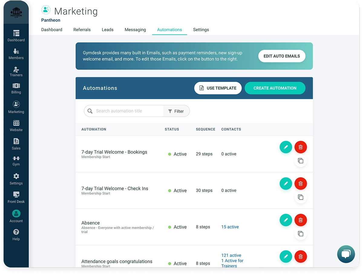 Gymdesk's automation engine covers the full member lifecycle—new leads, active members, frozen accounts, promotions, and bookings. No message caps. It's the difference between automating lead capture and automating your entire gym.