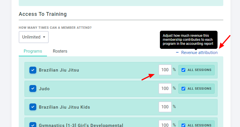To help report better on the revenue generated from each program, we've added the option to set the percentage of revenue each membership contributes to any of the programs it provides access to. For example, if you have a membership that provides access to 2 programs, and you would like revenue from that membership to contribute equally to each program, you can set each program to 50% revenue attribution.