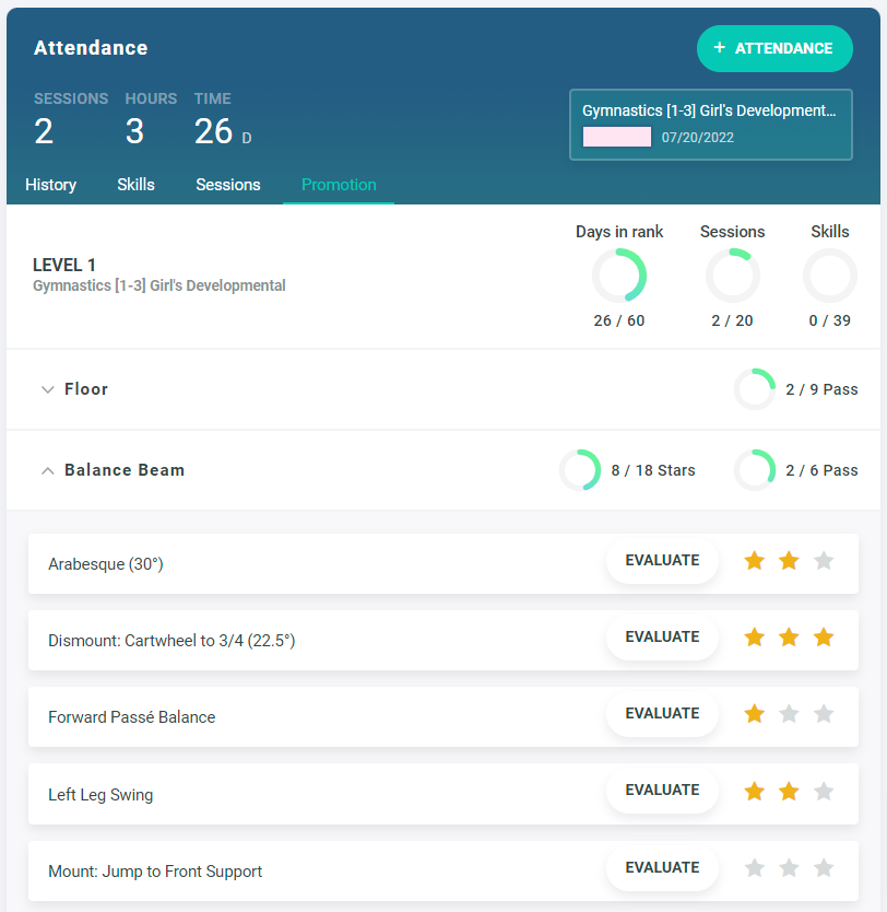 We've also redesigned the "Promotion" tab in the member's attendance screen to better show their progress towards the next rank. It shows totals by category and per measure type -