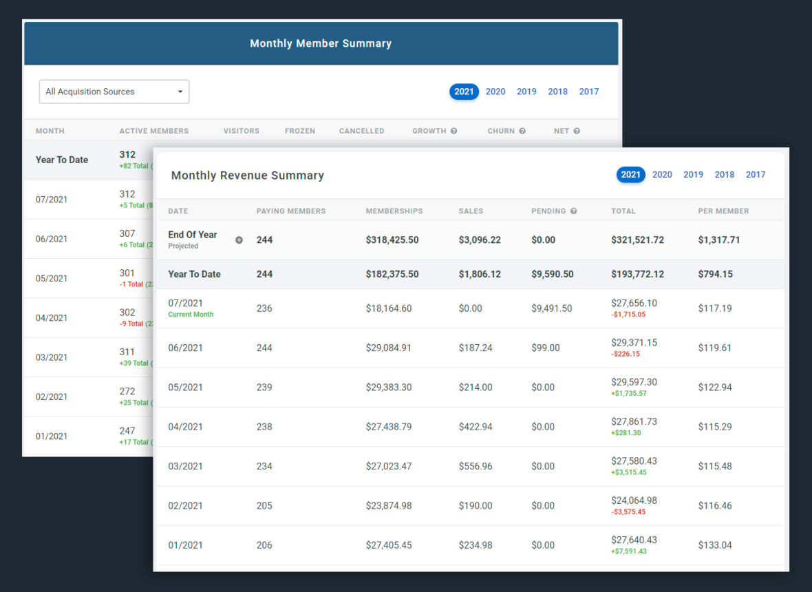 With our gym reporting software, you can get a detailed overview of your business performance, track monthly revenue and yearly projections, receive notifications on member personal training progress, billing, and memberships and track acquisition, retention and churn rate.