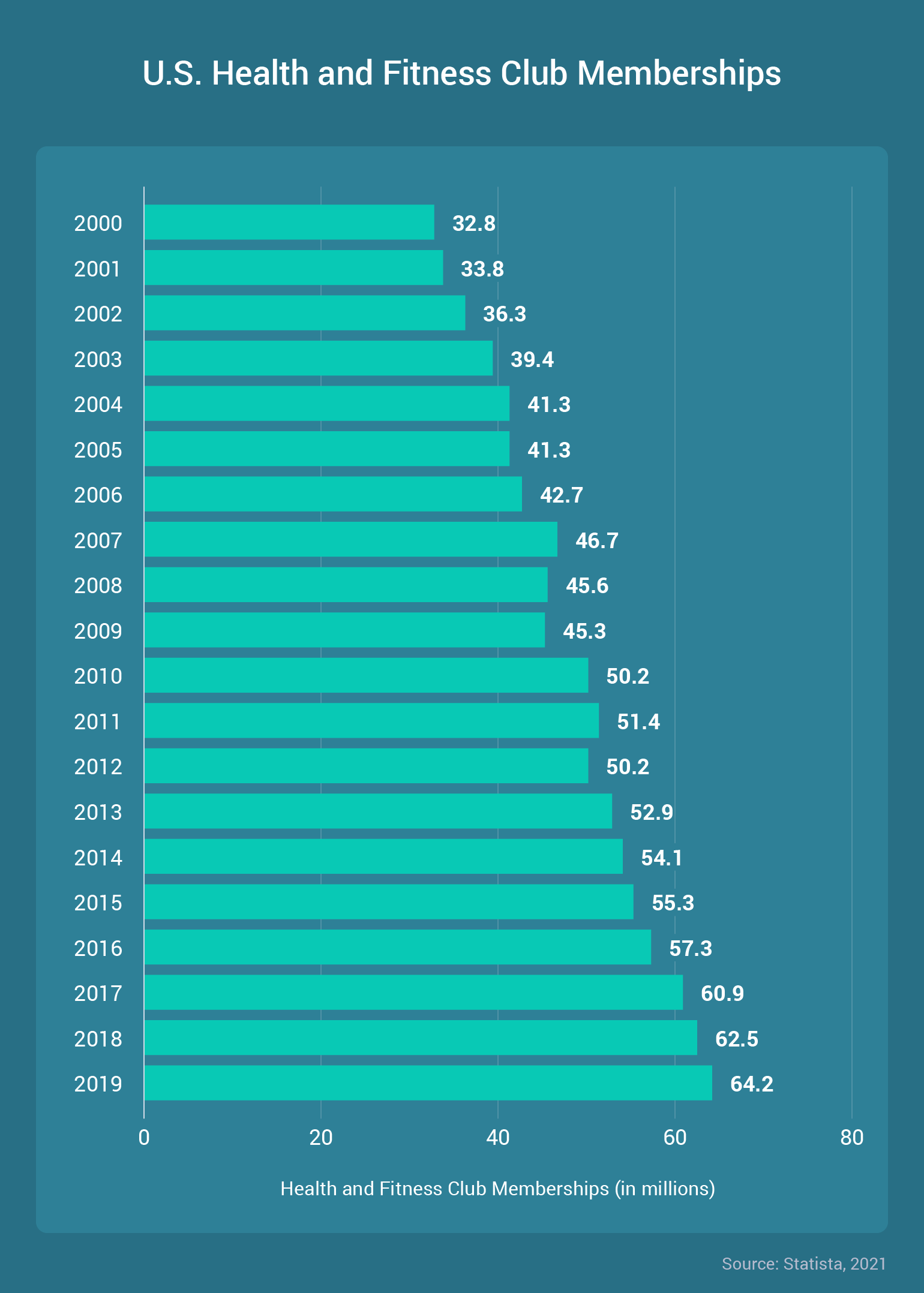 - Globally, there are an estimated 184.59 million gym memberships (Statista, 2019).