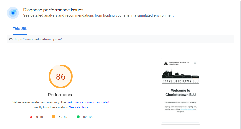 Charlton Brazilian Jiu Jitsu Society, who uses our website feature. The site scores 86 on Google PageSpeed, which is very good considering they have not specifically optimized their assets for it -