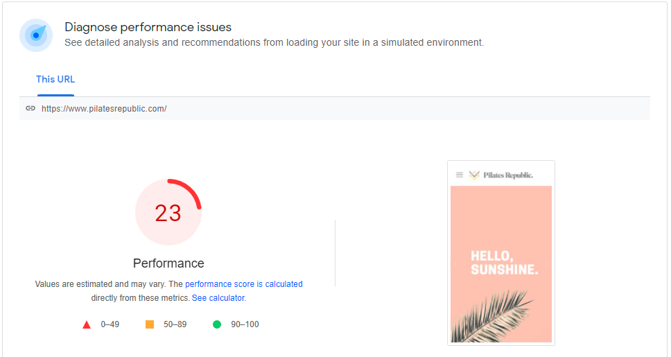 Then let's take a look at Pilates Republic which uses SquareSpace. It's a good looking site, however it scores only 23 on Google PageSpeed.