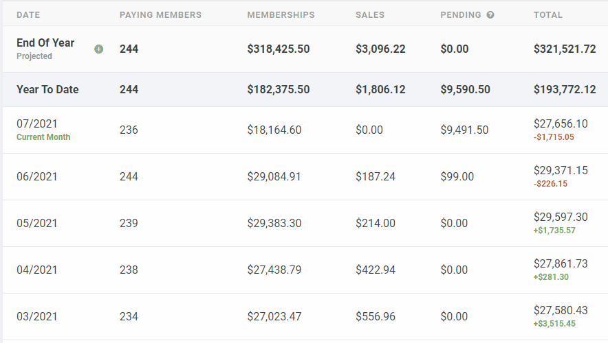 At the top of the report, we show projected revenue numbers for the rest of the year. Projected membership revenue is based on active recurring payments and future scheduled payments. Projected point-of-sale revenue is based on the average monthly sales revenue calculated for the year to date.