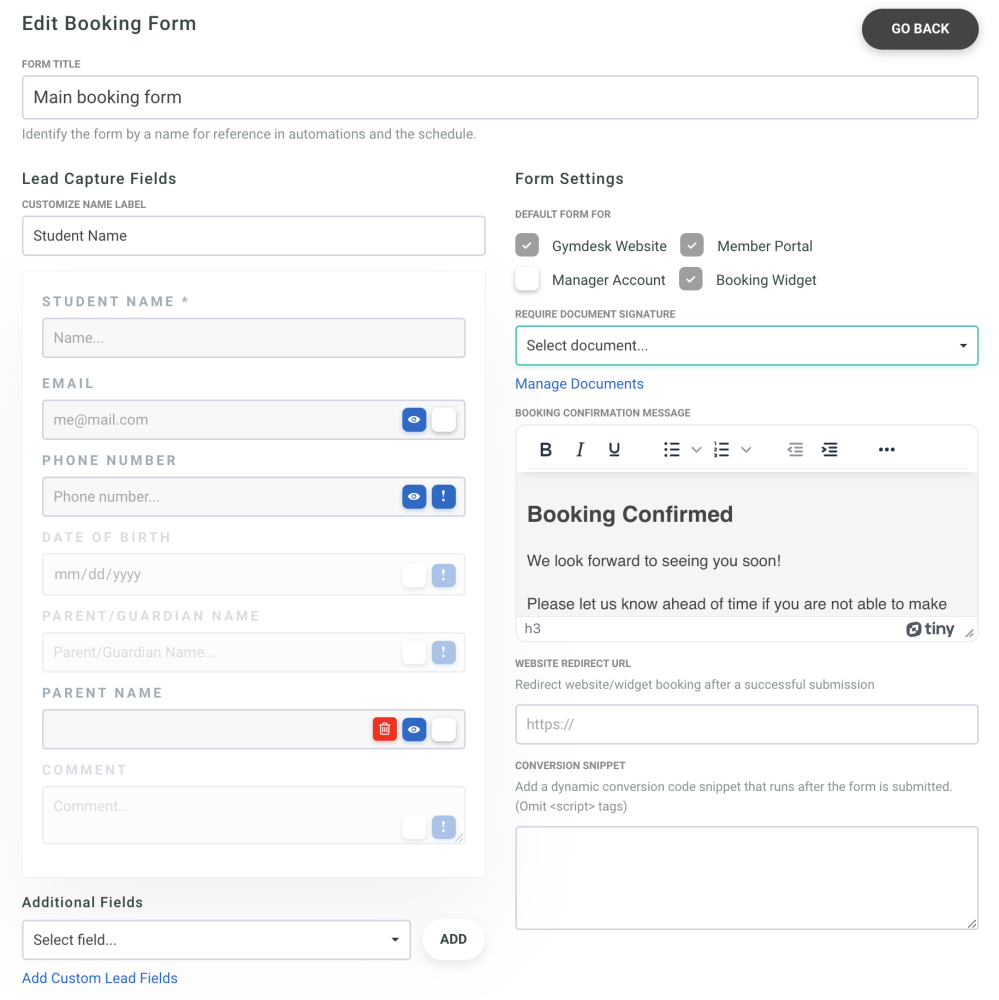 You can now add your own custom fields or add popular options like Date of Birth or Parent Name to any form to make sure you're capturing the right info from your clients right when they book.