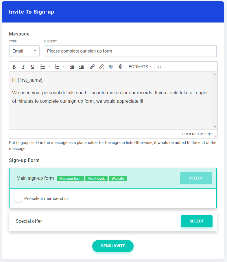 When you click on the "Invite to sign-up" button on the lead profile (or use the "Invite" feature from the members list), you can now customize the invitation message based on your existing template, choose whether to send it over Email or text, pick which sign-up form to use (you can now create multiple sign-up forms - more on that later), and even select a specific membership for them to have on the sign-up form.